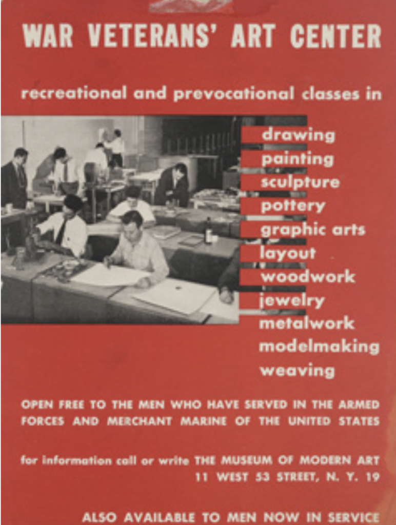 From 1944 – 48, the Museum of Modern Art (MOMA) hosted the War Veterans’ Art Center and used therapists trained in the visual arts to help with rehabilitation. “The principle object of the Center” which served 1,485 post World War II veterans, “was to help veterans adjust themselves through the creative process,” according to a 1948 MOMA press release. (The poster for the Center, c. 1941–45. Source: MOMA).