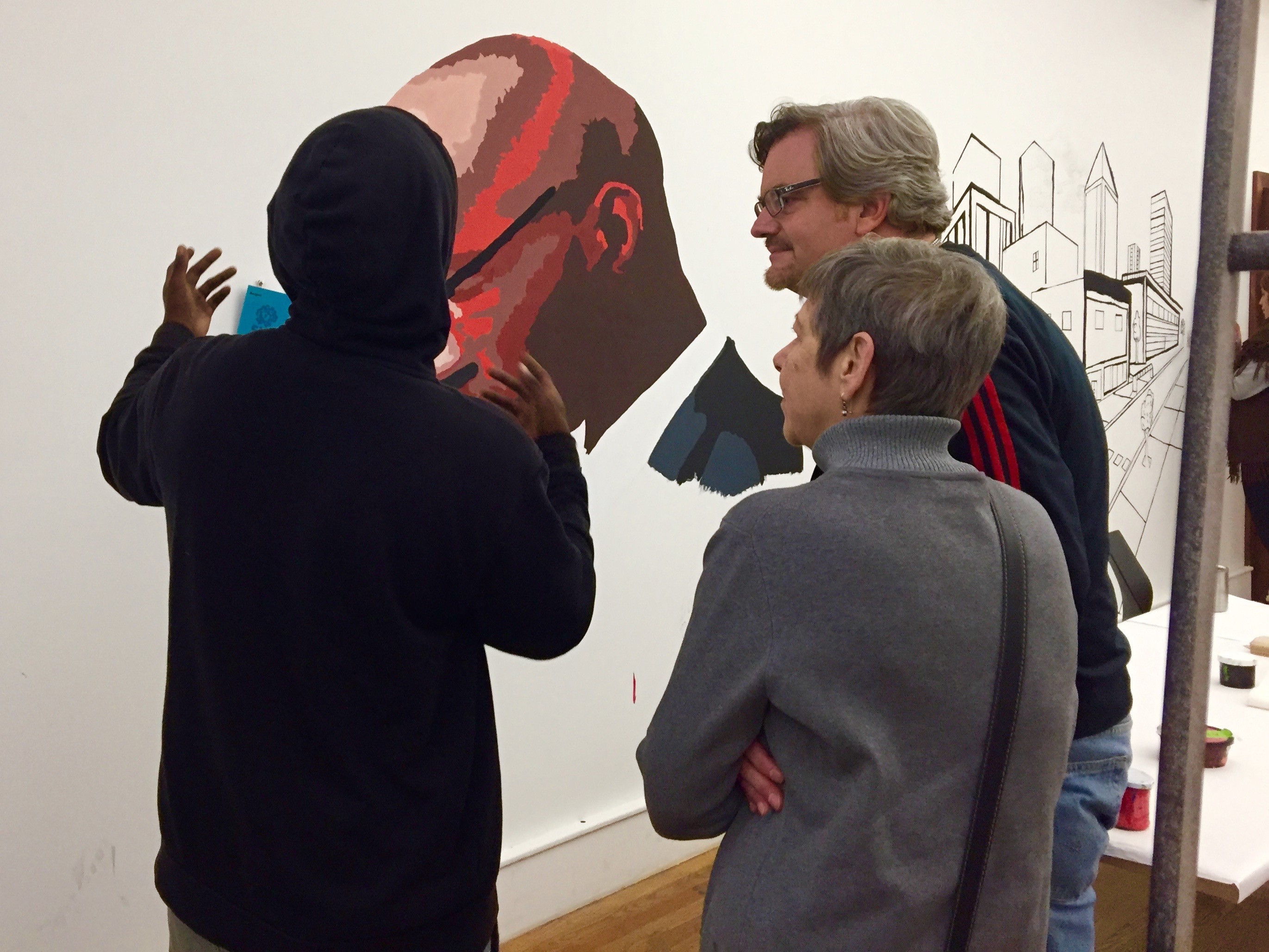 - Angel sharing his mural of a successful Black man with public participants Ronnie and Tom.