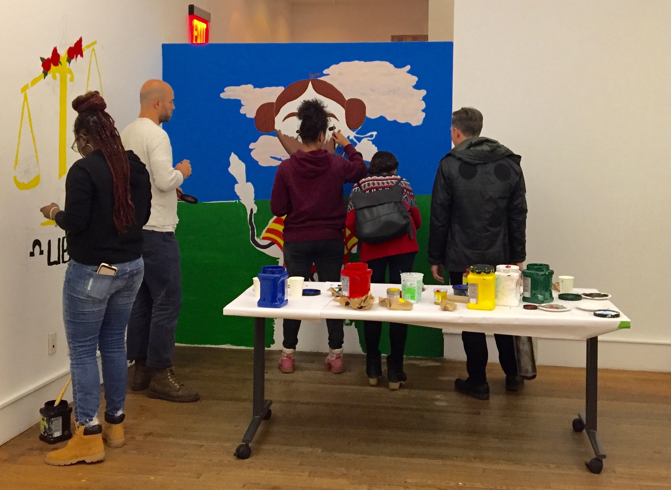 - Briana (Artistic Noise staff), Nic, Samantha, and public participants Barbara and Joe working together on Davon’s Libra mural and “MW” by Samantha.