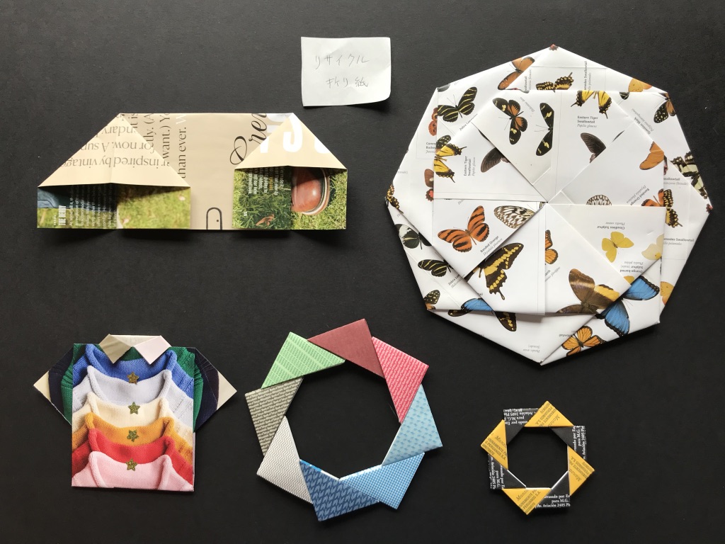 - Recycle Origami using found paper: brochures, pamphlet, teabag envelope, and security envelope.