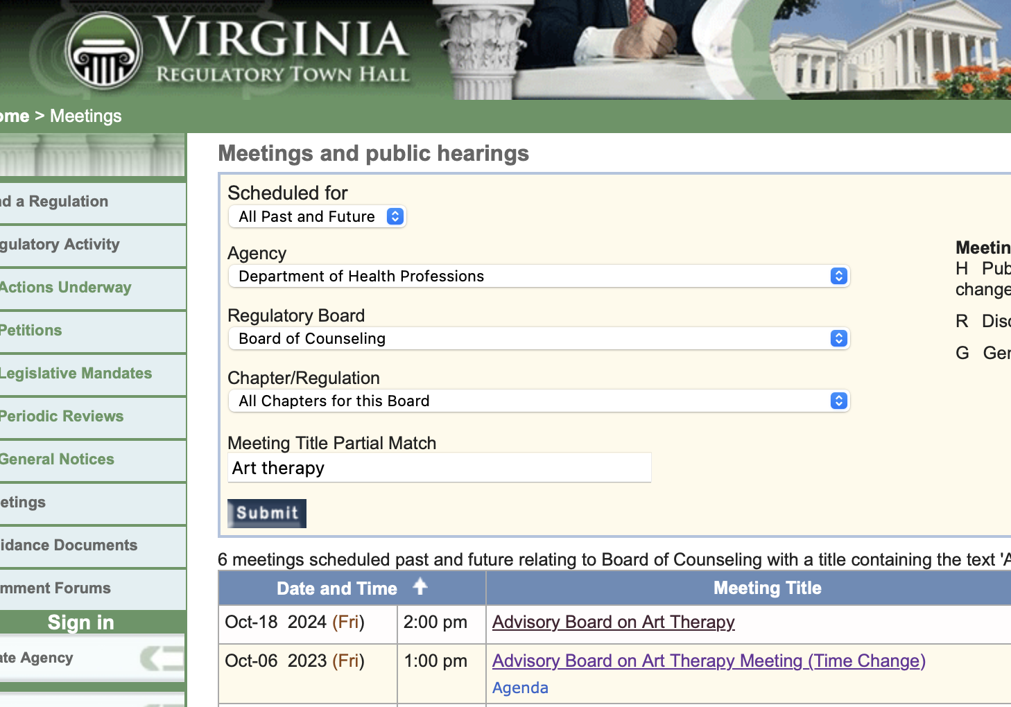 As you may recall, then-Governor Ralph Northam signed SB 713 into law on March 11, 2020, which established licensure for art therapists under the Board of Counseling. Proposed regulations were sent to Governor Glenn Younkin in early 2022 for his consideration. And then the momentum stalled.