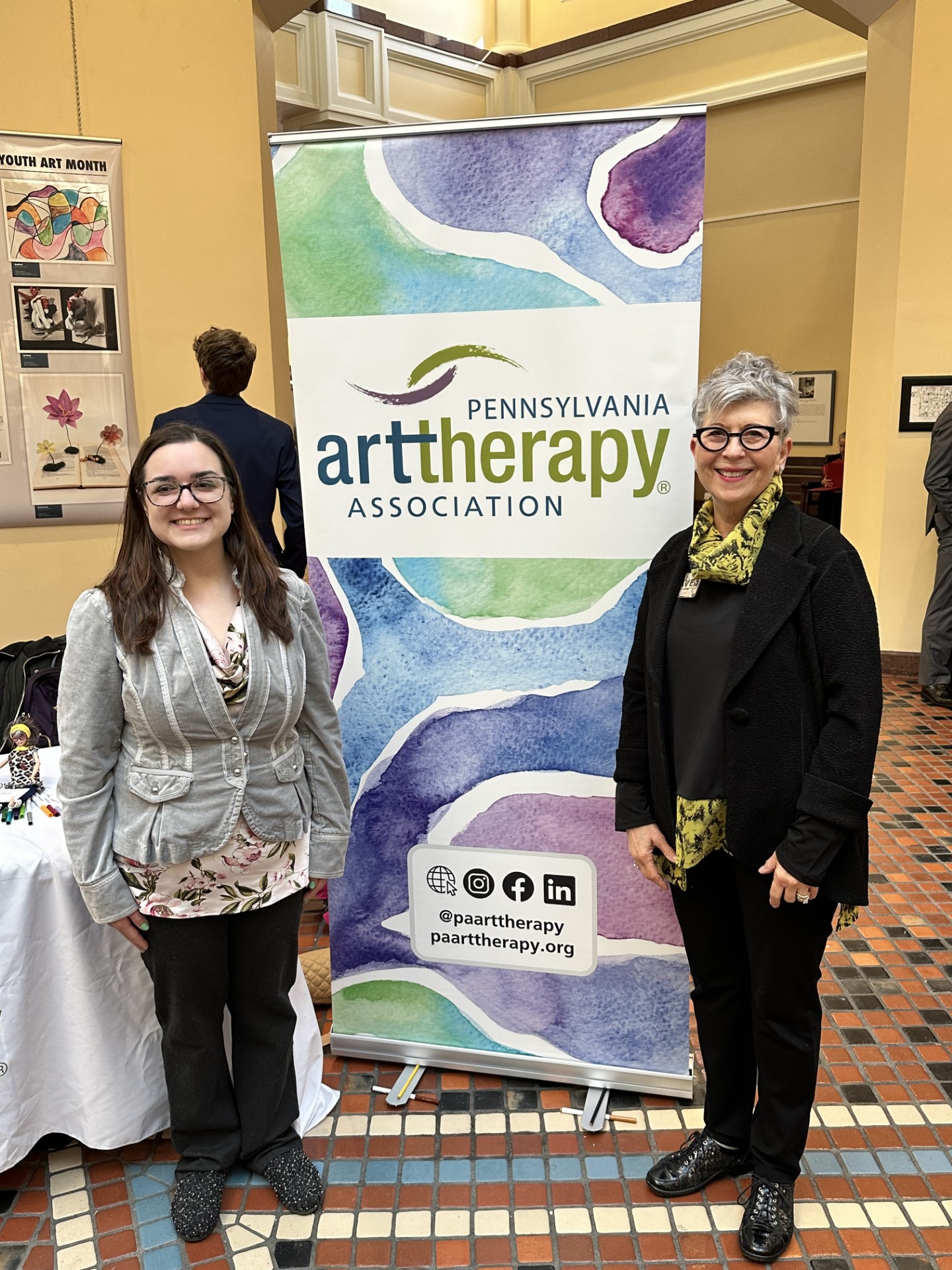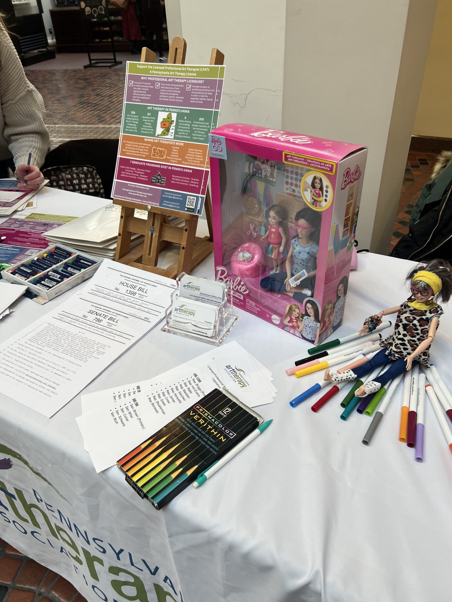 Gretchen Tucker, ATR-BC, LPC (Licensure Committee), and Irene Silva (Graduate Art Therapy Student from Cedar Crest College, former PAATA student representative) staffed the PAATA table and were spectacular in answering questions from Hill Day visitors who were curious about our profession. The East Wing Rotunda was quite active that day, and indeed, Art Therapist Barbie supported our efforts!