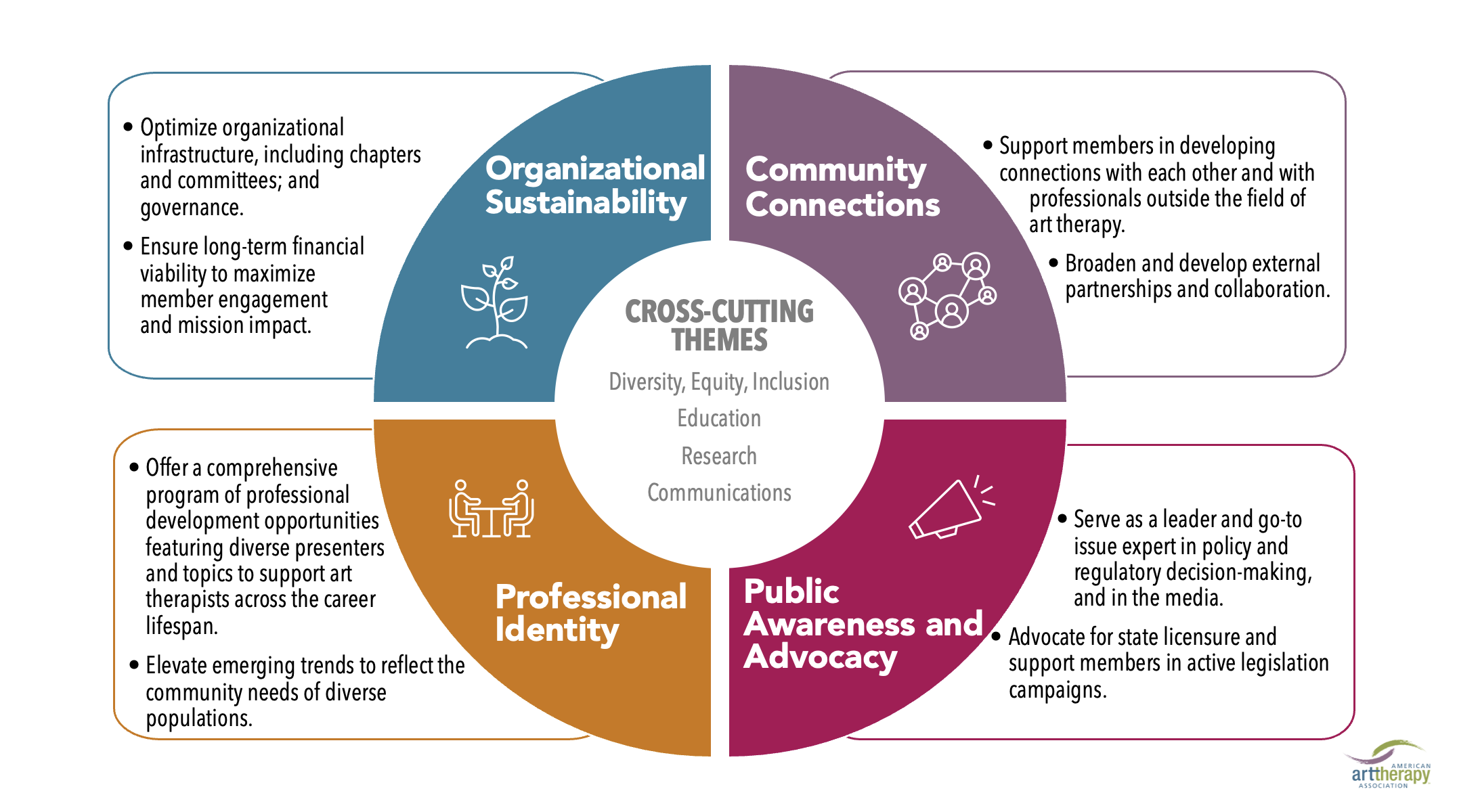 The strategic plan recognizes that there are critical cross-cutting themes that intersect our main priorities: Diversity, Equity, and Inclusion (DEI); Education; Research; and Communications.